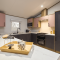 Cuisine fonctionnelle et moderne : réfrigérateur-congélateur, cuisinière, micro-ondes intégrés et possibilité d’ajouter lave-linge, lave-vaisselle