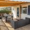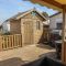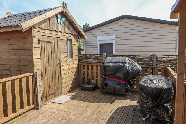 - Abri de jardin en bois et terrasse en bois semi-couverte et aménagée.
