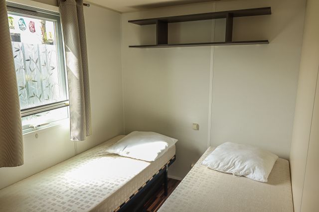 - Une seconde chambre avec deux lits jumeaux, un pouf ainsi que des rangements.