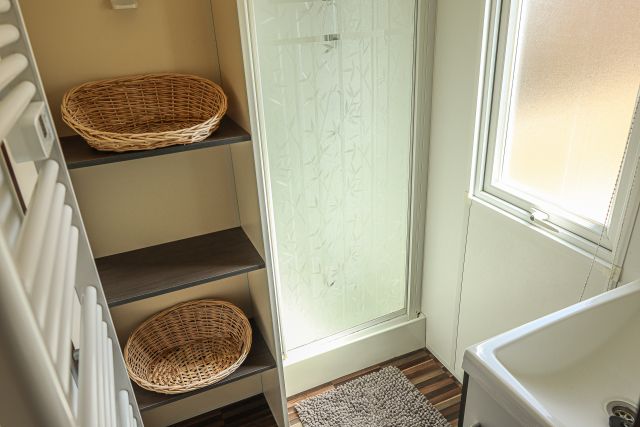 - Une salle d'eau avec cabine de douche, évier, sèche serviette et rangements.