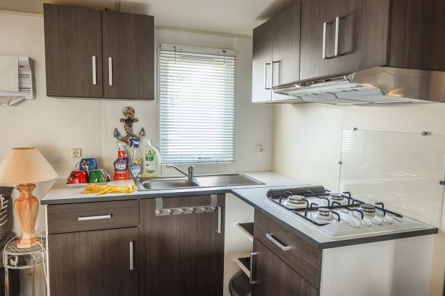 - Une cuisine équipée (réfrigérateur/congélateur, plaque de cuisson 4 feux au gaz, hotte électrique aspirante, four à micro-ondes, évier, rangements, etc).