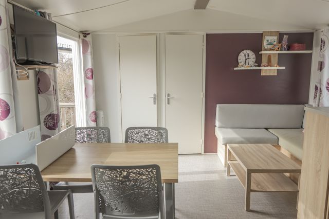 - Un séjour disposant d'une banquette d'angle, une table basse, une table à manger et ses chaises, une télévision murale, ainsi que des rangements.