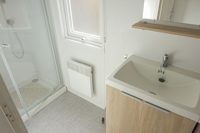 - Une salle d'eau avec cabine de douche, miroir mural et évier.