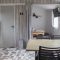 - Une salle d'eau avec cabine de douche, évier, rangements et miroir mural.