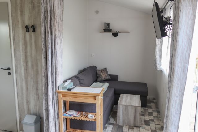 - Un séjour disposant d'une table à manger et ses chaises, une télévision, un miroir mural et des rangements. Coin salon transformable en troisième chambre grâce au canapé convertible et aux rideaux.