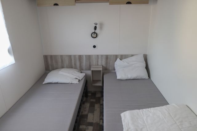 - Une seconde chambre avec deux lits jumeaux, un chevet et des rangements.